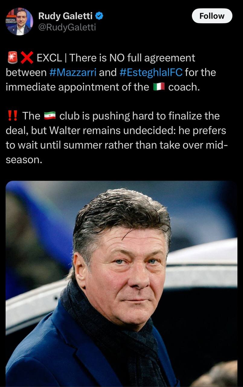 در همین حال «رودی گالتر» خبرنگار ایتالیایی با انتشار پستی در شبکه اجتماعی X در خصوص آخرین روند مذاکره باشگاه استقلال با ماتزاری نوشت: هنوز توافق نهایی بین والتر ماتزاری و استقلال صورت نگرفته است. باشگاه ایرانی به شدت در تلاش است تا این قرارداد را نهایی کند اما سرمربی ایتالیایی همچنان مردد است و ترجیح میدهد تا تابستان صبر کند و در میانه فصل هدایت تیمی را بر عهده نگیرد.