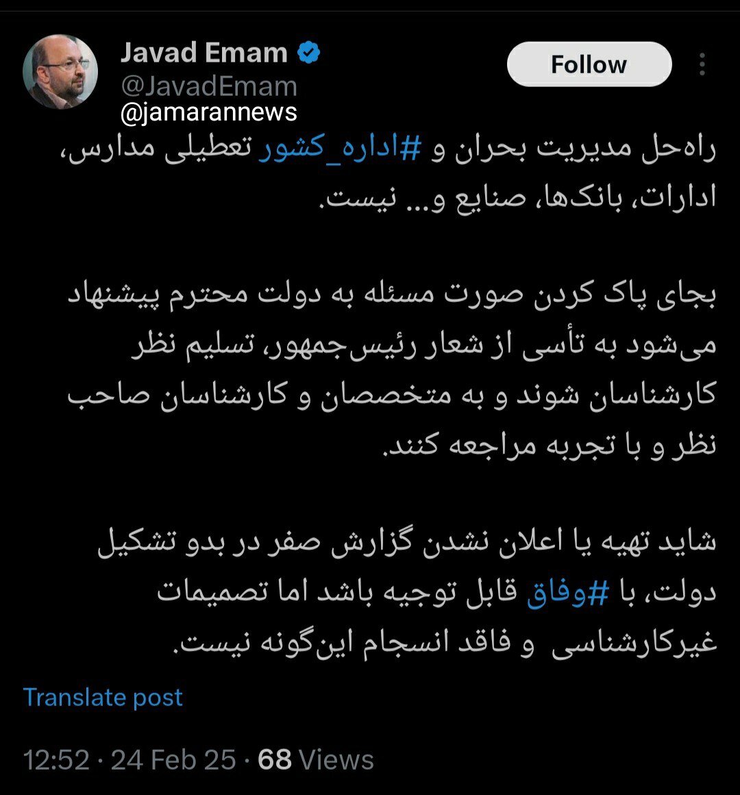 به گزارش خبرگزاری خبرآنلاین، جواد امام سخنگوی جبهه اصلاحات، در شبکه اجتماعی ایکس نوشت: