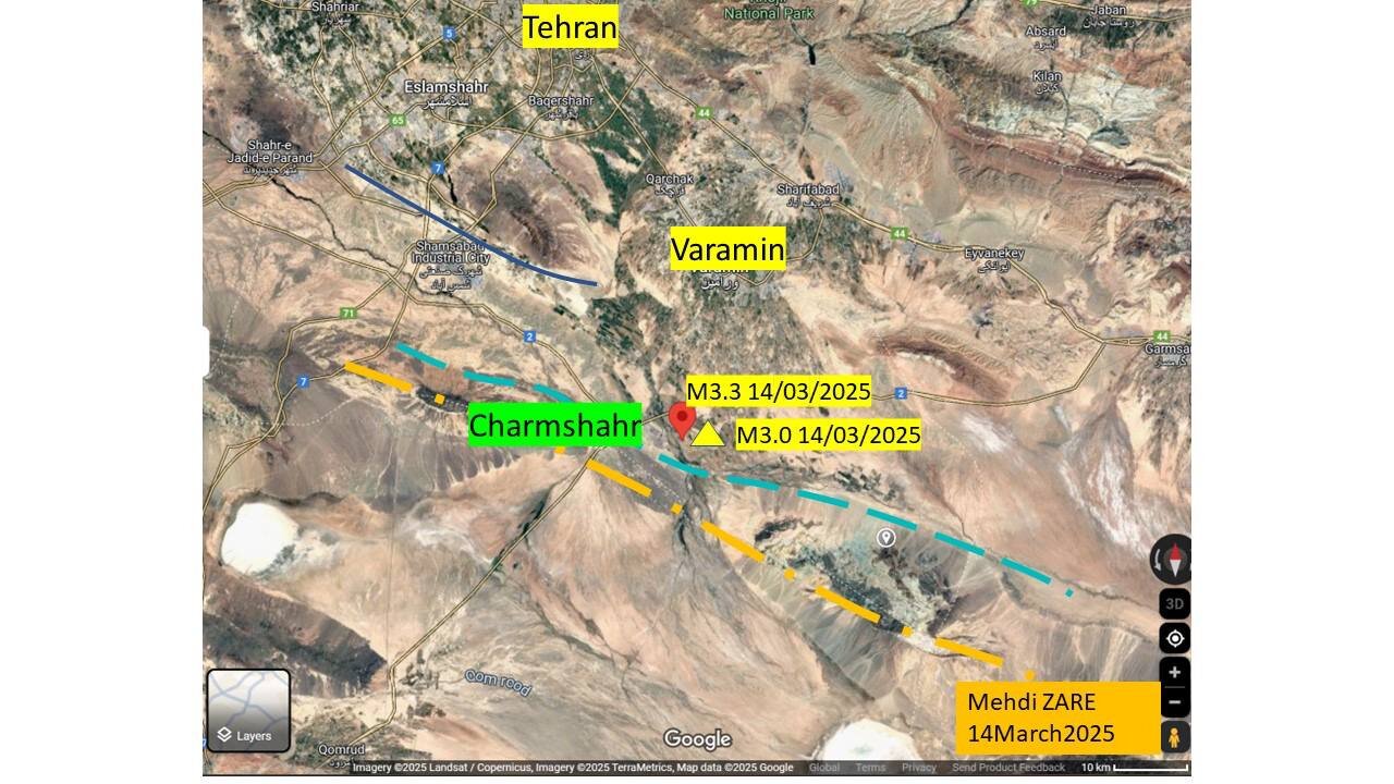 فرهاد طالبیان: دو زمینلرزه با بزرگای ۳.۳ و ۳ در چرمشهر در جنوب استان تهران رخ داد، مهدی زارع، کارشناس زلزله دراینباره به خبرآنلاین میگوید: «این زلزلههای کوچک حدود ۲۰ کیلومتری جنوب غرب ورامین در مرز استانهای تهران و قم و در شمال رد گسل کوشک نصر ثبت شدند. این پهنه حدود ۸۰ کیلومتری جنوب تهران است. سامانههای گسله در این پهنه فشاری با مولفههای امتداد لغز هستند. دو راستای شمالغرب – جنوب-شرقی و شرقی غربی در این پهنه به هم می رسند. زلزلههای ۲۲ و ۲۳ مرداد ۹۴ در محدوده جواد آباد ورامین نیز با وجود بزرگای ٤.١ که زلزله کوچکی است ولی نزدیکی کانون به تهران (٦٤ کیلومتری جنوب شرق تهران در زلزله های تابستان ۱۳۹۴)، و قرار داشتن کانون زلزله در منطقه ورامین مورد توجه قرار گرفت.»