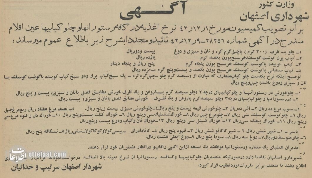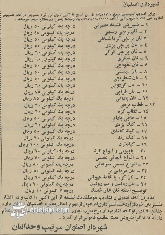 به گزارش خبرآنلاین از اطلاعات آنلاین، در آستانه نوروز ۱۳۴۴ سرتیپ حسن وحدانیان، شهردار وقت اصفهان با صدور چند اطلاعیه و انتشار آنها در مطبوعات قصد کنترل قیمتکالا و خدمات در این شهر را داشت. نرخنامه شهرداری تهران برای انواع غذا در رستورانها به همراه نرخ انواع شیرینی در قنادیهای اصفهان را بخوانید.