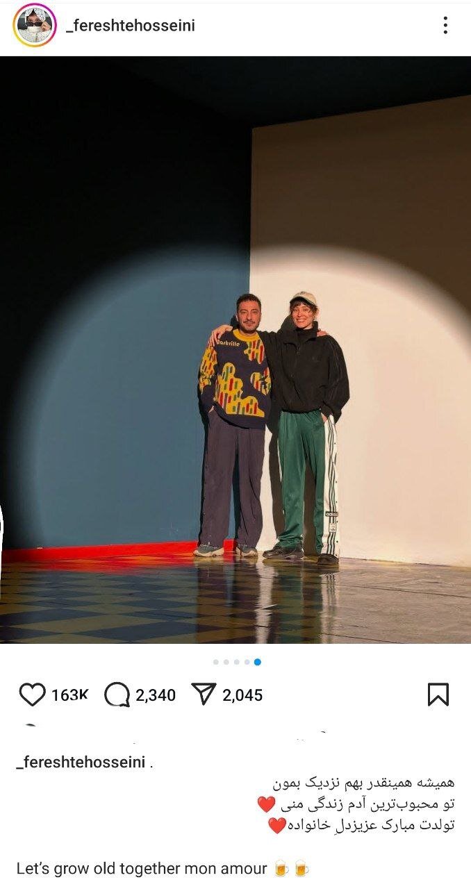 همسر این بازیگر فرشته حسینی با انتشار تصویر و متنی عاشقانه در اینستاگرام تولد او را تبریک گفت. او در این پست نوشت: «تو همیشه همین قدر بهم نزدیک بمون، تو محبوبترین آدم زندگی منی، تولدت مبارک عزیز دل خانواده.»