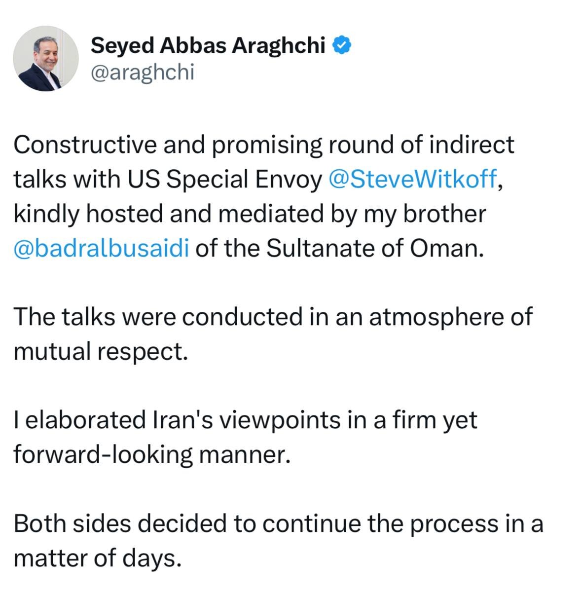 به گزارش خبرآنلاین، وزیر خارجه کشورمان رئیس هیات مذاکره کننده با هیات آمریکایی در حساب کاربری خود در شبکه ایکس نوشت: دور اول مذاکرات غیرمستقیم با فرستاده ویژه ایالات متحده آقای ویتکاف، با میزبانی و میانجیگری برادرم جناب بدر البوسعیدی از سلطنت عمان سازنده و امیدوارکننده بود.