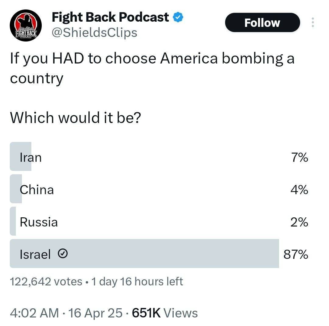 به گزارش خبرآنلاین در سوال این نظرسنجی آمده: اگر مجبور بودید آمریکا را برای بمباران کشوری انتخاب کنید کدام را انتخاب می کردید؟ (کشورهای ایران، چین و روسیه)