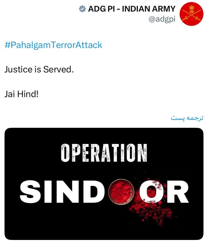 ارتش هند در پست دیگری در شبکه ایکس با انتشار این پوستر نوشت: عدالت اجرا می شود.