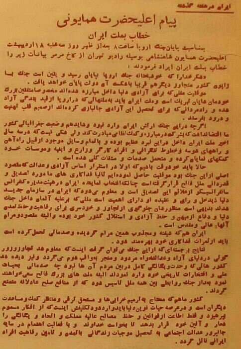 به گزارش خبرگزاری خبرآنلاین به نقل از اطلاعات آنلاین، مردم تهران از طریق بلندگوهای شهرداری مستقر در میدان توپخانه و بازار تهران از پایان جنگ جهانی دوم خبردار شدند. روزنامه اطلاعات ۱۸ اردیبهشت ۱۳۲۴ با انتشار نسخه چاپ دوم اخبار پایان جنگ را منتشر کرد. عصر رادیو تهران پیام محمدرضا پهلوی را منتشر کرد. اخبار پایان جنگ جهانی دوم به روایت روزنامه اطلاعات را بخوانید و عکسها را تماشا کنید.