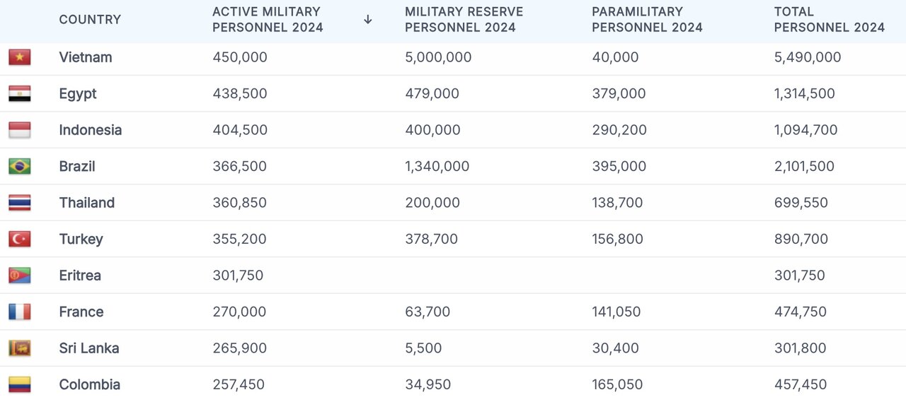 شمار زیاد نیروهای ذخیره و شبهنظامی در کشورهایی مانند کرهشمالی، ویتنام و کرهجنوبی موجب شده که این کشورها در رتبههای بالای جدول قرار بگیرند، اگرچه نیروی فعال آنها محدودتر است.