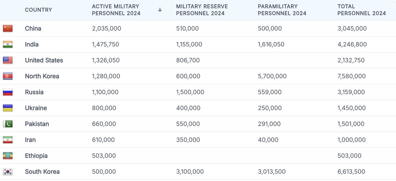 کشورهای دارای بیشترین مجموع نیروی نظامی (فعال، ذخیره و شبهنظامی)