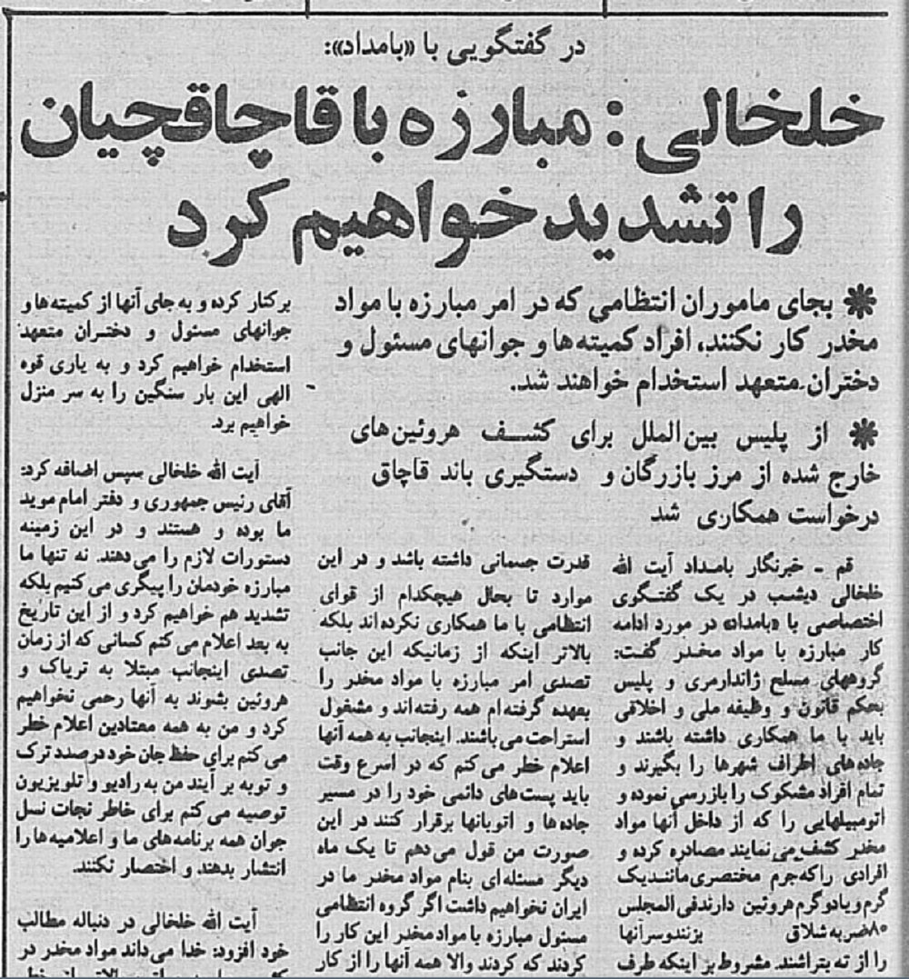 به گزارش خبرگزاری خبرآنلاین، در اردیبهشت ۱۳۵۹ آیتالله صادق خلخالی که پیشتر حاکم شرع دادگاههای انقلاب بود، با حکم بنیصدر رئیسجمهور وقت سرپرست کمیته مبارزه با مواد مخدر شد. خلخالی در امر مبارزه با مواد مخدر بهشدت و با قاطعیت برخورد میکرد و هیچگونه مدارایی را در برابر قاچاقچیان و مصرفکنندگان مواد مخدر برنمیتابید تا جایی که بسیاری از افرادی که دوران تصدی او را بر این کمیته به خاطر دارند، هنوز تلاشش را در این زمینه میستایند. با این حال به نظر میرسد خلخالی با همه قاطعیتش در پیشبرد اهداف خود با مصائبی نیز همراه بود، چراکه بسیاری از نهادهای مربوط که به نوعی باید دستورات کمیته مبارزه با مواد مخدر را نیز اجرا میکردند، با این نحو برخورد همدلی چندانی نداشتند. خلخالی در گفتوگویی که شامگاه شنبه هفدهم خرداد ۵۹ یعنی حدود یک ماه پس از تصدیاش در این سمت با خبرنگار روزنامه «بامداد» انجام داد، در این باره نیز سخن گفت و بهشدت از اهمال این نهادها به طور ویژه نیروهای انتظامی در اجرای دستوراتش ابراز نارضایتی کرد و با آنان اتمام حجت نمود که چنانچه به این روش ادامه دهند همه را برکنار و به جایشان از کمیتهها بهره خواهد برد. او در ادامه با لحنی تهدیدآمیز به معتادان اخطار کرد که «برای حفظ جان خود در صدد ترک و توبه برآیند» و خطر مواد مخدر را از «خطر دموکراتها در کردستان» بالاتر دانست.