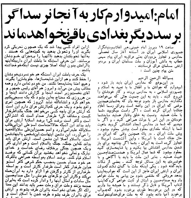 در این موقع که مدارس ایران باید باز شود، امیدوارم که جوانان ما و اطفال ما با تعهد به اسلام و جمهوری اسلامی، به مدارس بروند و کار خودشان را شروع کنند. باید به این جمعیتهایی که میخواهند نگذارند مدارس باز بشود توجه داد که به شما در همچنین موقعی که ایران در این واقعه است و عراق رسما اعلام جنگ با ایران کرده است، اگر راست میگویید، شما خودتان در این امر با دولت همراهی کنید، و اگر دیدیم که شما در مدارس ایجاد اغتشاش کردید ماهیت شما با اینکه مقداری معلوم است بیشتر معلوم میشود، پیش ملت ایران. در یک همچنین وقتی که ایران در حال جنگ است با آمریکا، و این آلت دست آمریکا، تجاوز کرده است به ایران، شما اگر چنانچه برای باز شدن مدارس اغتشاش بپا بکنید و یا شایعهسازی کنید معلوم میشود که شما عمال آمریکا و همدست صدام حسین خبیث هستید.