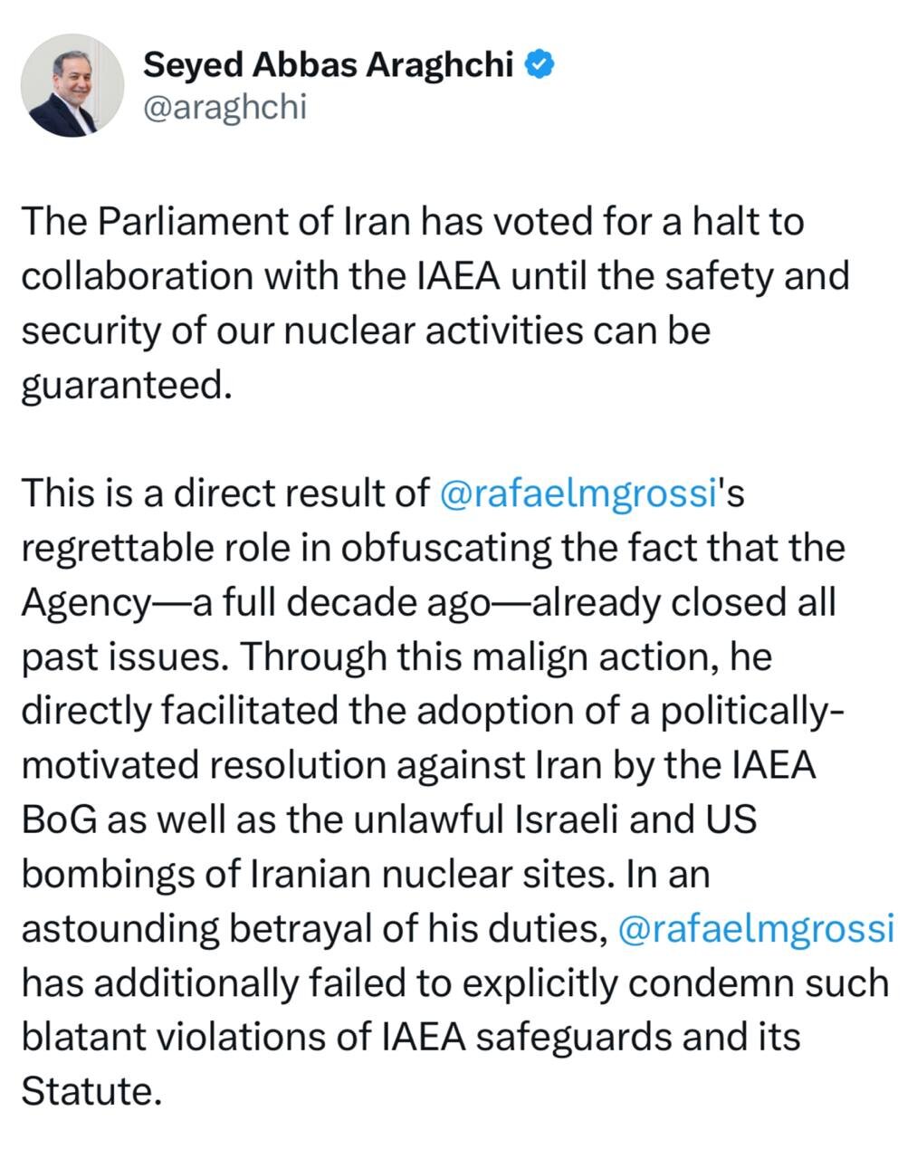 مجلس ایران به توقف همکاری با آژانس بینالمللی انرژی اتمی رأی داده است، تا زمانی که ایمنی و امنیت فعالیتهای هستهای ما تضمین شود.