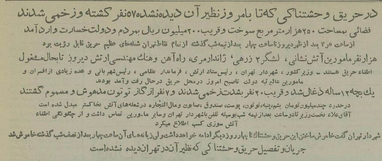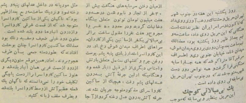هفته نامه تهران مصور در ۲۳ تیر ۱۳۳۴ در ابتدای گزارش خود در باره حریق بزرگ جنوب تهران گزارشی منتشر کرد: