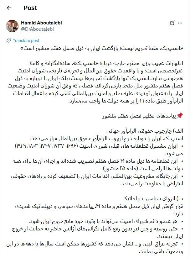 به گزارش خبرآنلاین، حمید ابوطالبی دیپلمات پیشکسوت و تحلیل‌گر سیاسی در شبکه اجتماعی ایکس در واکنش به اظهارات سیدعباس عراقچی وزیرخارجه کشورمان نوشت با عنوان «اسنپ‌بک، فقط تحریم نیست؛ بازگشت ایران به ذیل فصل هفتم منشور است» نوشت: اظهارات عجیب وزیر محترم خارجه درباره «اسنپ‌بک»، ساده‌انگارانه و کاملا غیرتخصصی است؛ و با واقعیات حقوق بین‌الملل و تجربه‌ی تاریخی شورای امنیت هم‌خوانی ندارد. اسنپ‌بک تنها بازگشت تحریم‌ها نیست؛ بلکه ایران را دوباره به ذیل فصل هفتم منشور ملل متحد بازمی‌گرداند، فصلی که وفق آن شورای امنیت وضعیت ایران را به‌عنوان تهدیدی علیه صلح و امنیت بین‌المللی تلقی کرده و اعمال اقدامات الزام‌آور طبق ماده ۴۱ را بر همه دولت‌ها واجب می‌سازد.