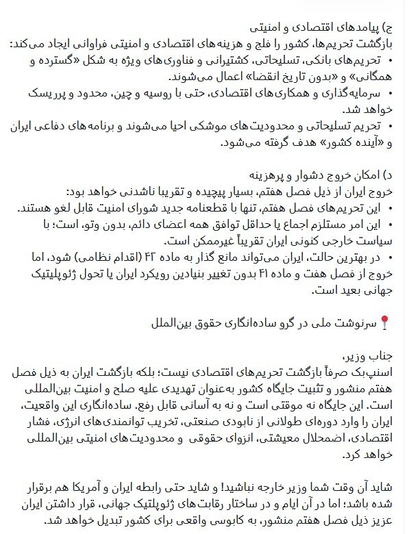 شاید آن وقت شما وزیر خارجه نباشید! و شاید حتی رابطه ایران و آمریکا هم برقرار شده باشد؛ اما در آن ایام و در ساختار رقابت‌های ژئوپلتیک جهانی، قرار داشتن ایران عزیز ذیل فصل هفتم منشور، به کابوسی واقعی برای کشور تبدیل خواهد شد.