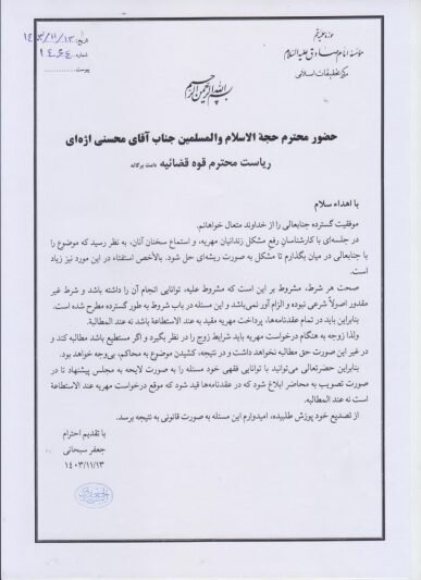 دفتر آیت الله العظمی سبحانی با انتشار نامه‌ای از ایشان نظر متفاوتی درباره نحوه پرداخت مهریه را مطرح کرد.