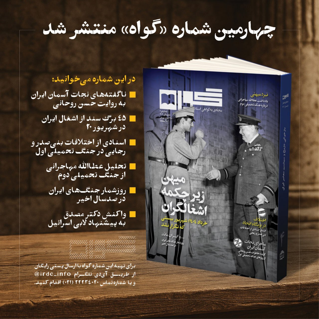 چهارمین شماره مجله گواه با طرح جلد «میهن زیر چکمه اشغالگران»، بررسی اسناد اشغال ایران در شهریور ۲۰ در ۴۸۰ صفحه به بهای ۳۵۰ هزار تومان در انتشارات مرکز اسناد انقلاب اسلامی روانه بازار نشر شد.