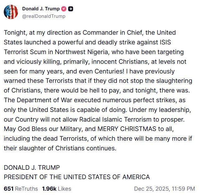 امشب، به دستور من بهعنوان فرمانده کل قوا، ایالات متحده حملهای قدرتمند و مرگبار علیه اوباش تروریست داعش در شمالغرب نیجریه انجام داد؛ کسانی که عمدتاً مسیحیان بیگناه را هدف قرار داده و بهطور وحشیانهای به قتل رساندهاند، در سطحی که سالها و حتی قرنها چنین چیزی دیده نشده بود!