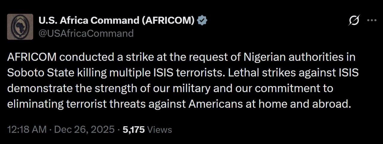 در همین حال فرماندهی آفریقای آمریکا در شبکه ایکس نوشت: به درخواست مقامات نیجریه، حملهای را در ایالت سوبوتو انجام داد که منجر به کشته شدن چندین تروریست داعش شد.