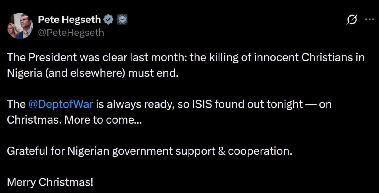وزیر جنگ آمریکا، پیت هگست نیز در شبکه ایکس نوشت: رئیسجمهور ماه گذشته صراحتاً اعلام کرد که کشتار مسیحیان بیگناه در نیجریه (و سایر نقاط) باید متوقف شود.