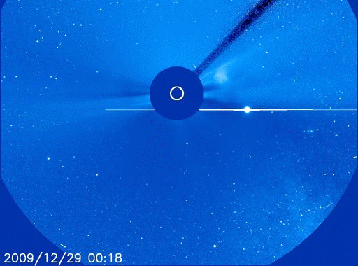 صبح امروز به وقت ایران (سهشنبه 8 دی، 29 دسامبر)، فوران عظیمی در تاج خورشید روی داد و تودهای از ذرات پرانرژی و باردار از پهلوی غربی خورشید به بیرون رانده شدند. تاجنگار فضاپیمای سوهو که به رصد خورشید میپردازد، توانست این توده کمسرعت را به ثبت کند. (این فیلم در قالب gif ارایه شده است)