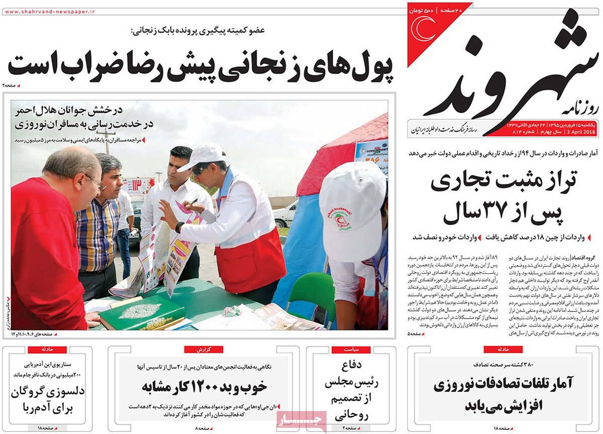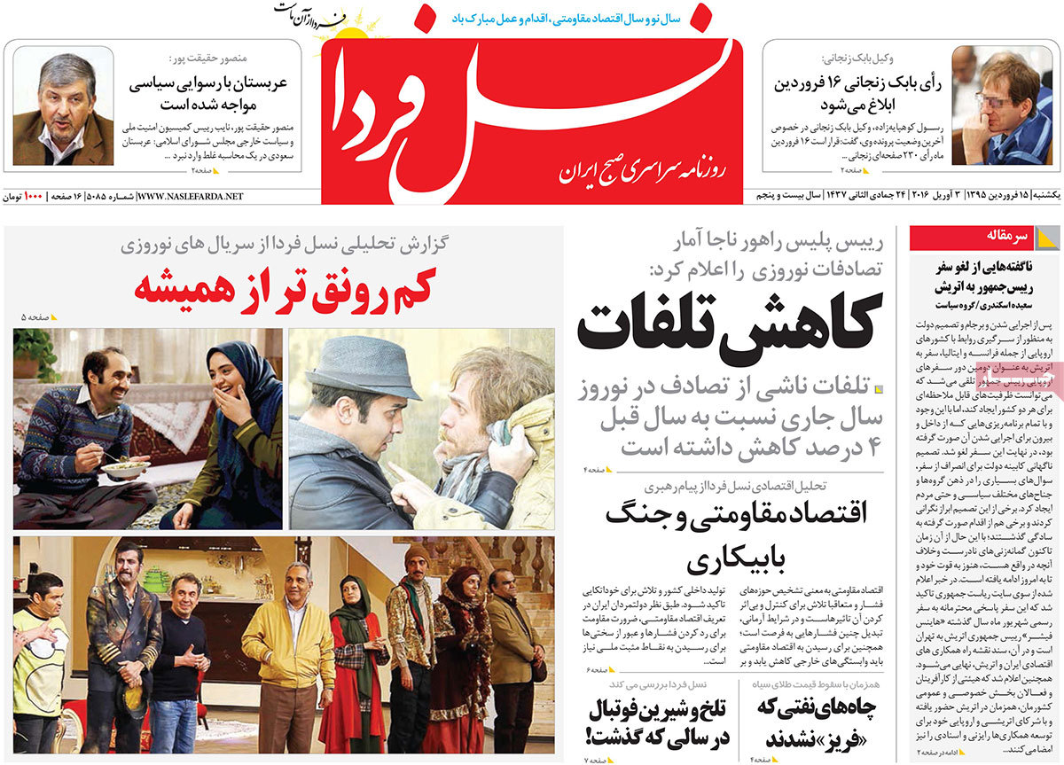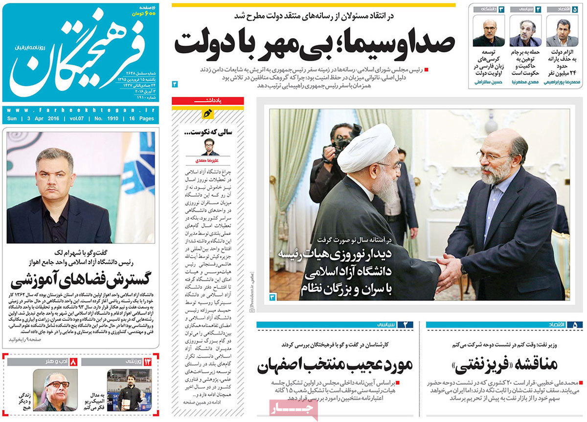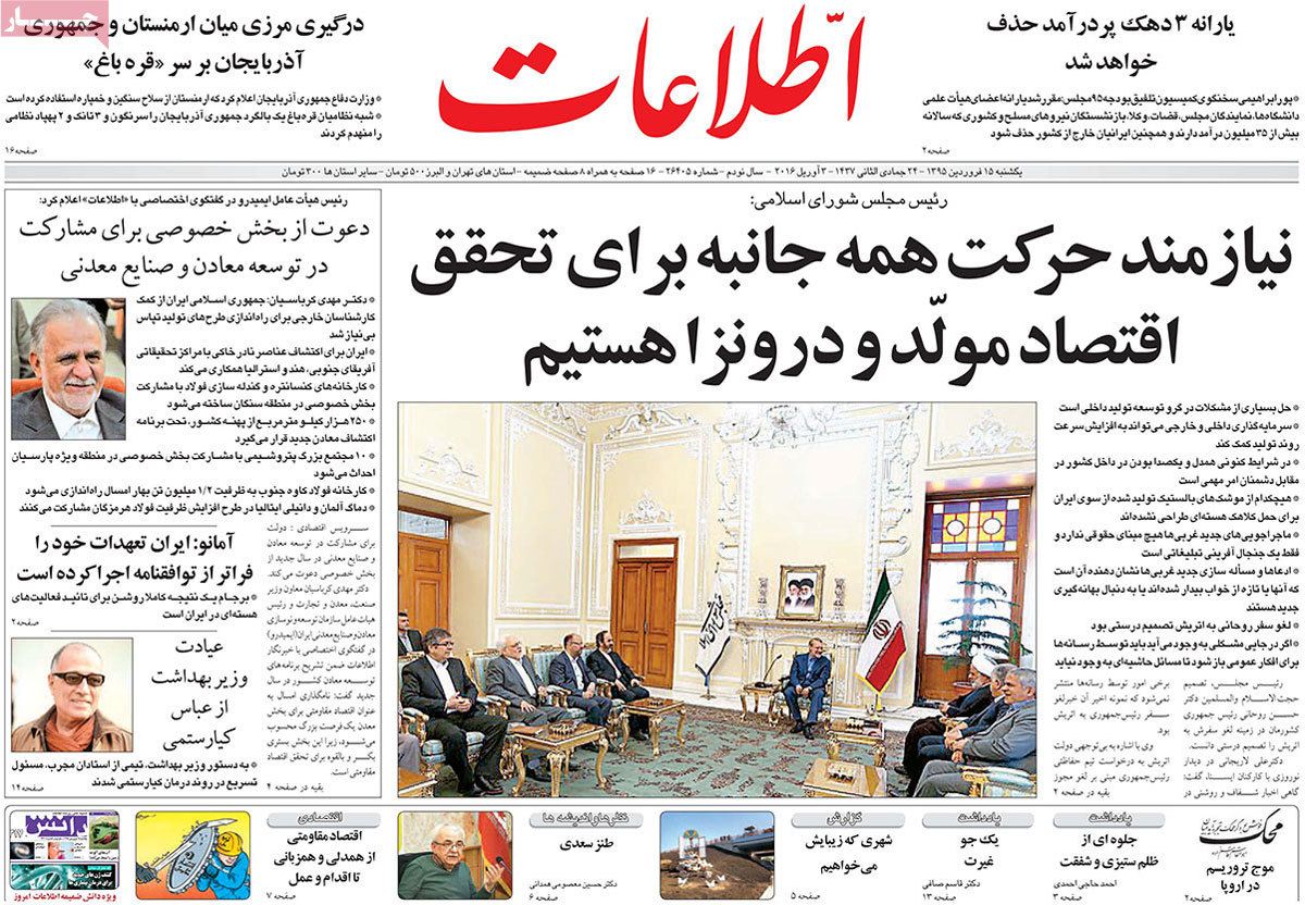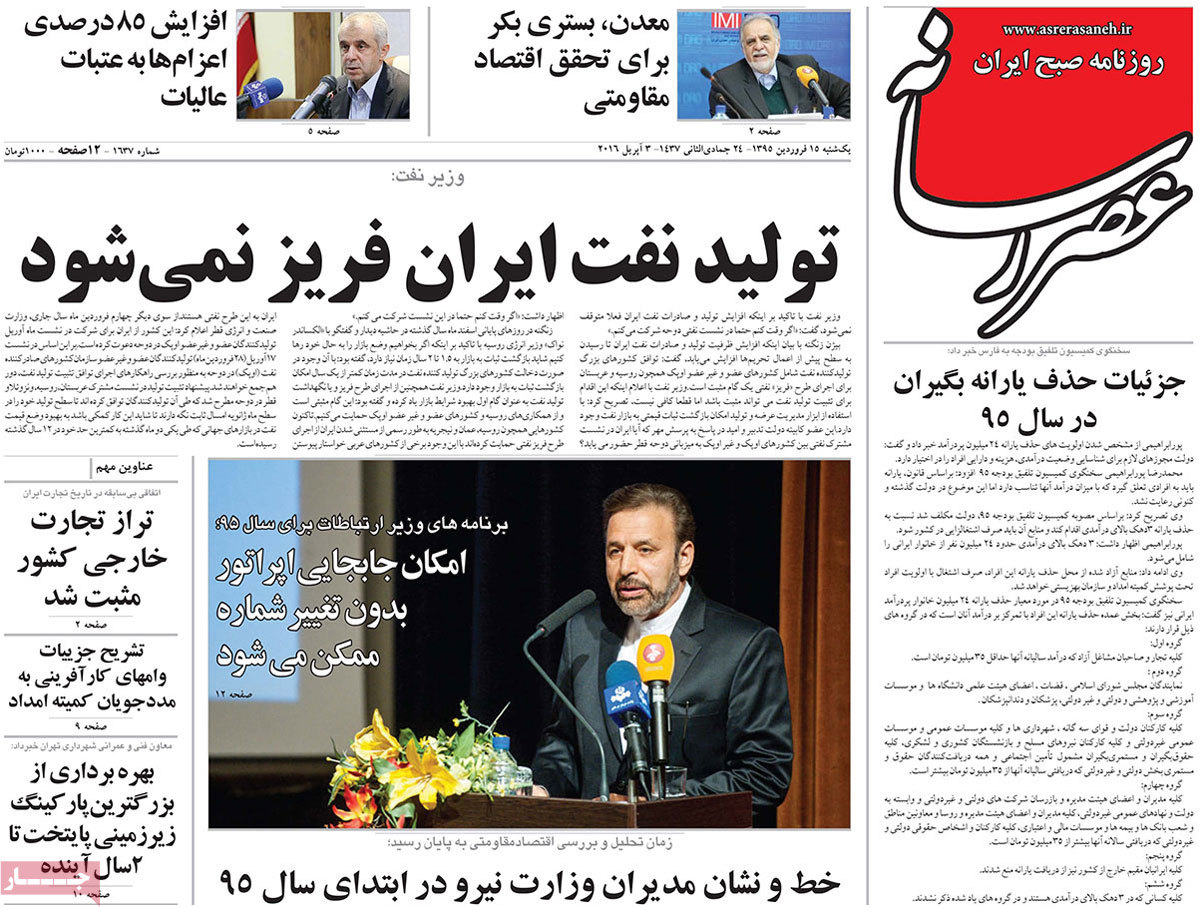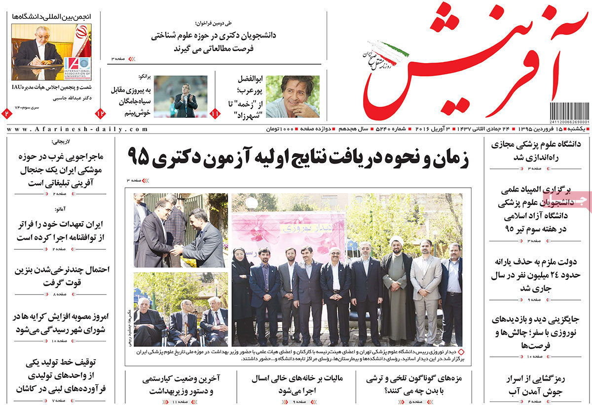https://khabaronline.ir/x6t2j ۱۵ فروردین ۱۳۹۵ - ۰۲:۰۲ کد خبر 523432 اخبار چندرسانهای عکس ۰ نفر ۱۵ فروردین ۱۳۹۵ - ۰۲:۰۲ تصویر صفحه اول روزنامه های یکشنبه15فروردین1395 مطبوعات امروز تیترهای متنوعی را در صفحه اول خود جای داده اند. 17302 کد خبر 523432 برچسبها مطبوعات خبرهای مرتبط تصویر صفحه اول روزنامه های شنبه14فروردین1395