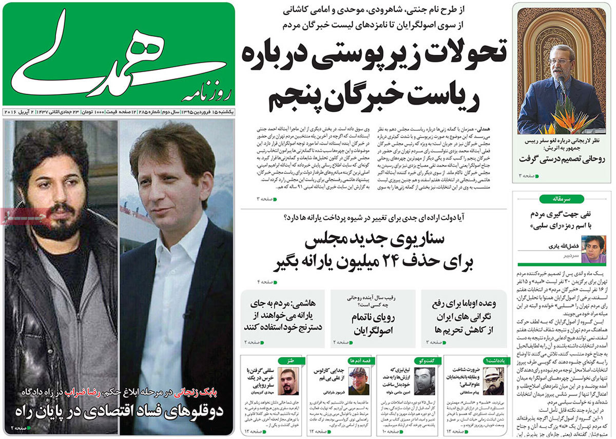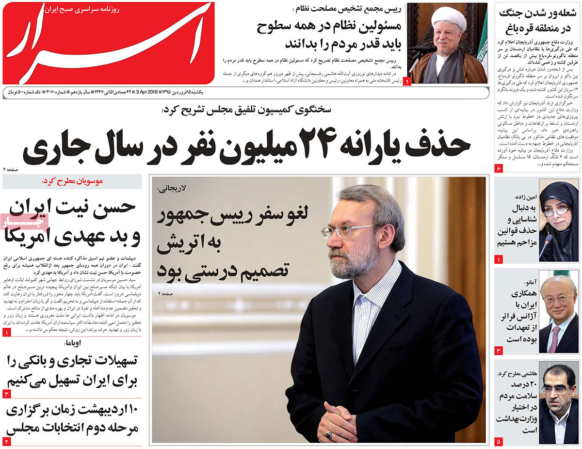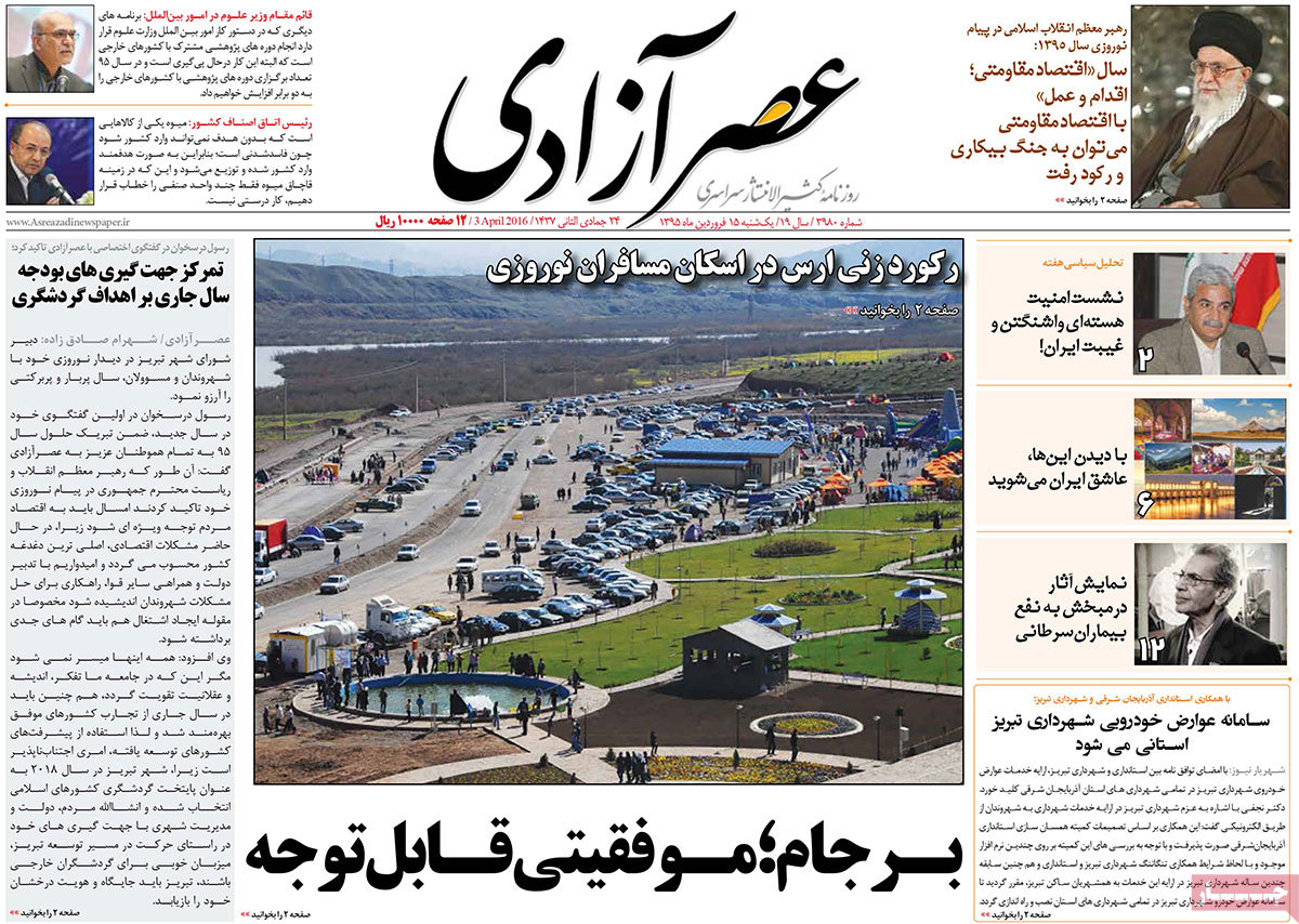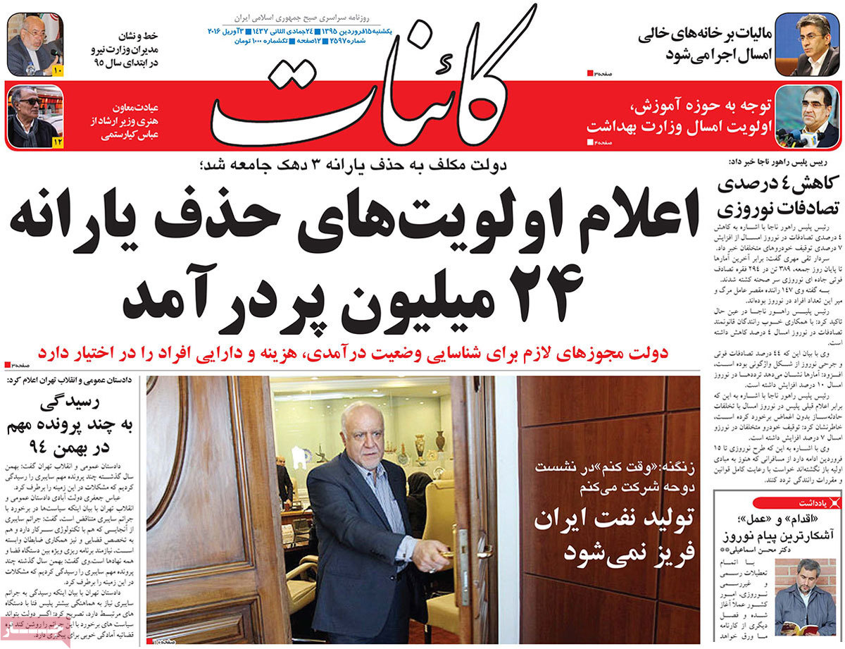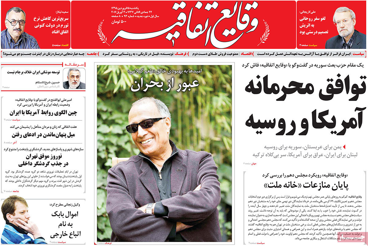 https://khabaronline.ir/x6t2j ۱۵ فروردین ۱۳۹۵ - ۰۲:۰۲ کد خبر 523432 اخبار چندرسانهای عکس ۰ نفر ۱۵ فروردین ۱۳۹۵ - ۰۲:۰۲ تصویر صفحه اول روزنامه های یکشنبه15فروردین1395 مطبوعات امروز تیترهای متنوعی را در صفحه اول خود جای داده اند. 17302 کد خبر 523432 برچسبها مطبوعات خبرهای مرتبط تصویر صفحه اول روزنامه های شنبه14فروردین1395