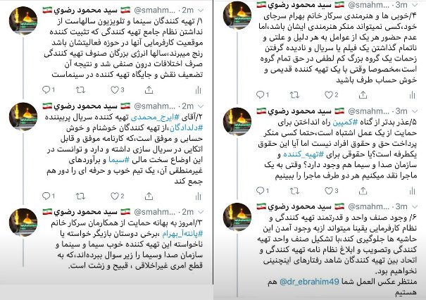 به گزارش خبرگزاری خبرآنلاین، سیدمحمود رضوی، تهیه کننده سینما، با انتقاد از حمایت بازیگران از پانتهآ بهرام در توییتی نوشت: «تهیهکنندگان سینما و تلویزیون سالهاست از نداشتن نظام جامع تهیهکنندگی که تثبیت کننده موقعیت کارفرمایی آنها در حوزه فعالیتشان باشد رنج میبرند ،سالها انرژی بزرگان صنوف تهیهکنندگی صرف اختلافات درون صنفی شد و نتیجه آن تضعیف نقش و جایگاه تهیهکننده در سینماست.