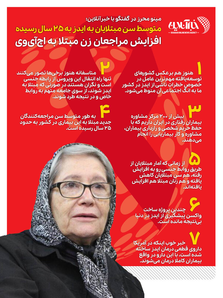 مینو محرز در گفتگو با خبرآنلاین گفت : متوسط سن مبتلایان به ایدز به ٢۵ سال رسیده است. هنوز هم برعکس کشورهای توسعهیافته مهمترین عامل در خصوص خطرات ناشی از ایدز در کشور ما به انگ اجتماعی آن منوط میشود.
