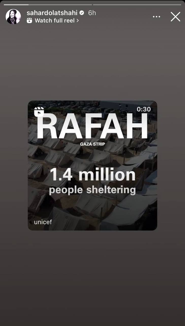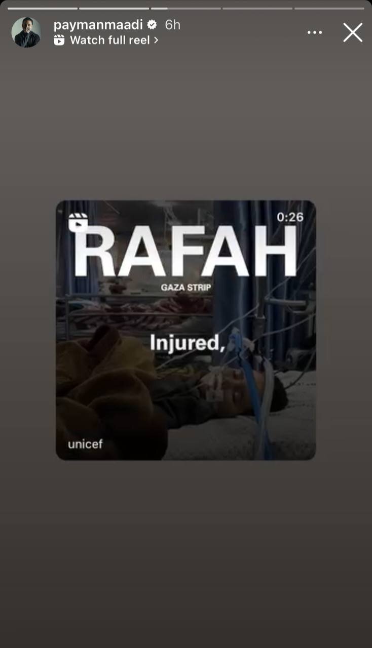 از هفتم خردادماه که خبرهایی از بمباران اردوگاه فلسطینیها در رفح منتشر و مشخص شد که شماری از مردم که بیشتر زنان و کودکان بودند، زنده، زنده در آتش سوختهاند، صفحههای شخصی برخی چهرههای فرهنگی و هنری در فضای مجازی با واکنش یا بازنشر این اخبار بهروز شدند. برخی از سینماگران از جمله پیمان معادی و سحر دولتشاهی پستی از یونیسف را منتشر کردند که آماری از وضعیت کودکان آواره، زخمی و کشتهشده را در نوار غزه و رفح نشان میدهد./ ایسنا