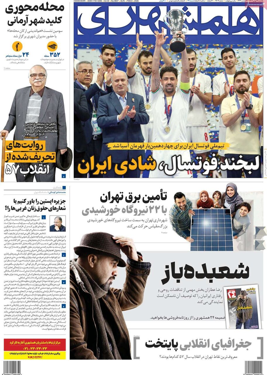 اخبار فرهنگی و هنری رسانه ۱۹ بهمن ۱۴۰۴ - ۰۵:۵۵ دریافت تصاویر صفحه اول روزنامه های یکشنبه 19بهمن 1404 بازتاب جهانی مذاکرات ایران و امریکا در عمانف تیتر برجسته برخی روزنامه های امروز است. 17302 برچسبها مطبوعات روزنامه چاپی رسانه داغ ترین های لحظه ویتکاف از ناو آبراهام لینکلن: با خلبانی که پهپاد ایران را سرنگون کرد دیدار کردم، عزم آمریکایی… جدیدترین خبر درباره دستمزد ۱۴۰۵ کارگران/ افزایش ۵۰ درصدی حقوق قطعی است؟ شبکه ملی اطلاعات جایگزین اینترنت بینالمللی میشود؟ ببینید | ادعای عجیب نبویان روی آنتن زنده شبکه افق: اجرای مدل ربایش مادورو در جنگ ۱۲ روزه در… خبرهای مرتبط صفحه اول روزنامه های شنبه 18بهمن 1404 / گزارش های خوشبینانه از مذاکرات عمان صفحه اول روزنامه های سه شنبه 14بهمن 1404/ مذاکره با امریکا، تیتر اصلی